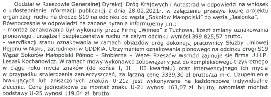 W lutym 2021 roku wystąpiłem do oddziału GDDKiA w Rzeszowie z wnioskiem o przesłanie projektu organizacji ruchu na tym odcinku. Zadałem też pytania o koszt zamontowania słupków rozdzielających pasy ruchu w przeciwnych kierunkach oraz o sposób i koszty utrzymania tych znaków. Wniosek złożyłem poprzez epuap i tą samą drogą oczekiwałem odpowiedzi. Niestety przez blisko 2 miesiące nie doczekałem się odpowiedzi.
