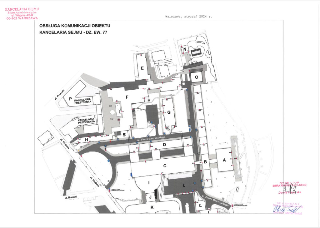 Pod koniec 2023 r. (już po wyborach, z nowym marszałkiem Sejmu) wystąpiłem do Kancelarii Sejmu o udostępnienie projektu organizacji ruchu dla terenu wewnątrz Sejmu.