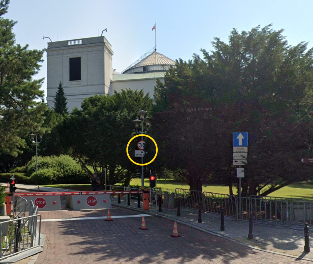 Gdy w marcu 2024 r. wystąpiłem do Wojewody Mazowieckiego o podjęcie działań w trybie nadzoru, to okazało się, że nie jest to możliwe, bo już nie ma tam strefy ruchu. Okazało się, że gdy zorientowano się w Kancelarii Sejmu, że ktoś się interesuje organizacją ruchu, to podjęto decyzję o likwidacji znaków D-52 i D-53.